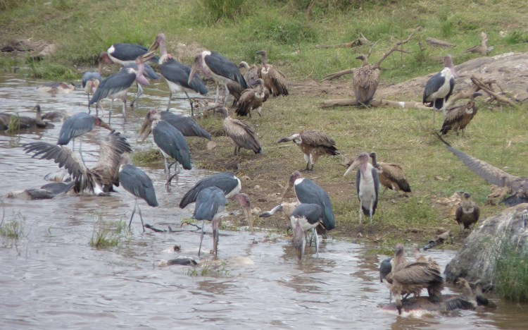However, it was humbling to think that the wildebeest we saw here had endured that incredibly dangerous feat we’re all too familiar with from the documentaries; the Mara river crossing. Although I didn’t get to witness it myself (I don’t think the 4am wake-up call required would’ve gone down well with everyone else in the group), the aftermath was all too clear when we reached the river during our game drive. The putrid stench of damp, rotting flesh was what hit our nostrils first as we walked over the bridge, and looking down into the current, the mangled corpses of the unlucky wildebeest, drowned or partially eaten by crocs, could be seen snagged on rocks. This provided an easy meal for the Savannah clean-up-crew of vultures and marabou storks, who flocked in their dozens to this gnu take-away whilst many more circled above, ‘waiting their turn’.