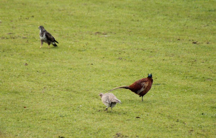So why did DEFRA even consider this plan? If anything buzzards are absolutely beneficial to pheasant shooting, keeping their numbers down so there aren’t so many ‘surplus’ after the shooting toffs have put a mark on the amount they can either eat or stuff in a pit. And anyway, buzzards are more inclined to go scouting for carrion, swoop down on rabbits or pluck earthworms than bother pheasants most of the time. The buzzard in this picture (taken from my bedroom window) was far more interested in the former than eating the bystanders.